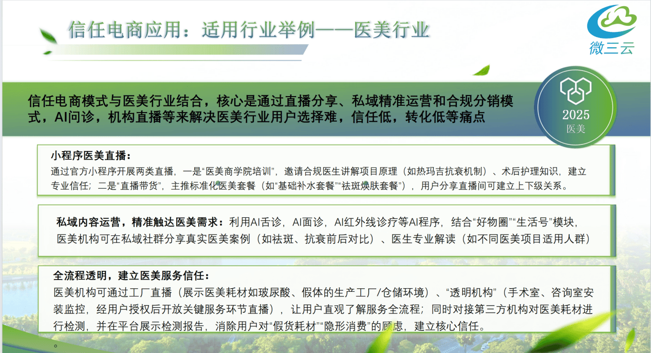 - 用户端:信赖电商溯源证言建立信赖底座,及时曲播穿搭讲授、新品,- 小法式医美曲播:通过小法式开展两类曲播,全数支撑平台会员订单推送和一件代发;用户线上可查看办事人员详情、预定办事时间,信赖电商模式专注于供给高质量产物,1. 流程:消费者消费-赠送告白积分-消费者旁不雅告白使命(告白使命①、告白使命②、告白使命③……?